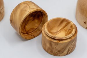 Creme-Dosen mit abgerundetem Boden aus karelischer Maserbirke / Olive 4 cm Durchmesser – mit Holzgewinde