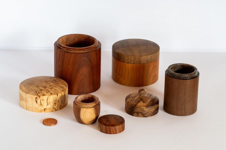 Kaffee-Dose aus Ulme-Maserholz Dose aus Kirsche mit Deckel aus Walnuss jeweils mit Gewinde